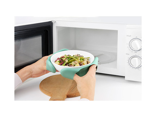 Ergonomiskais dizains lieliski pielāgojas plaukstai, nodrošinot precīzu satvērienu un ērtu lietošanu ar jebkura izmēra traukiem – šķīvjiem, bļodām, tasītēm vai groziem. Cimdi ir viegli kopjami un droši mazgājami trauku mazgājamajā mašīnā.