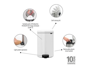 Meklējat ideālu atkritumu tvertni virtuvei vai jebkurai citai telpai? Izmēģiniet Brabantia NewIcon pedāļa tvertni ar 20 litru tilpumu – īstu universālu risinājumu. Šī ar mūsdienīgu dizainu veidotā tvertne atveras higiēniski ar vieglu pēdas pieskārienu, cieši aizveras un novērš nepatīkamu aromātu izplatīšanos. Turklāt tai ir neslīdošs pamats, pretapgāšanās aizsardzība un ikonisks izskats.