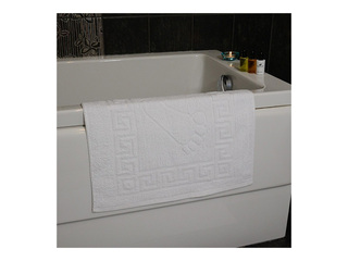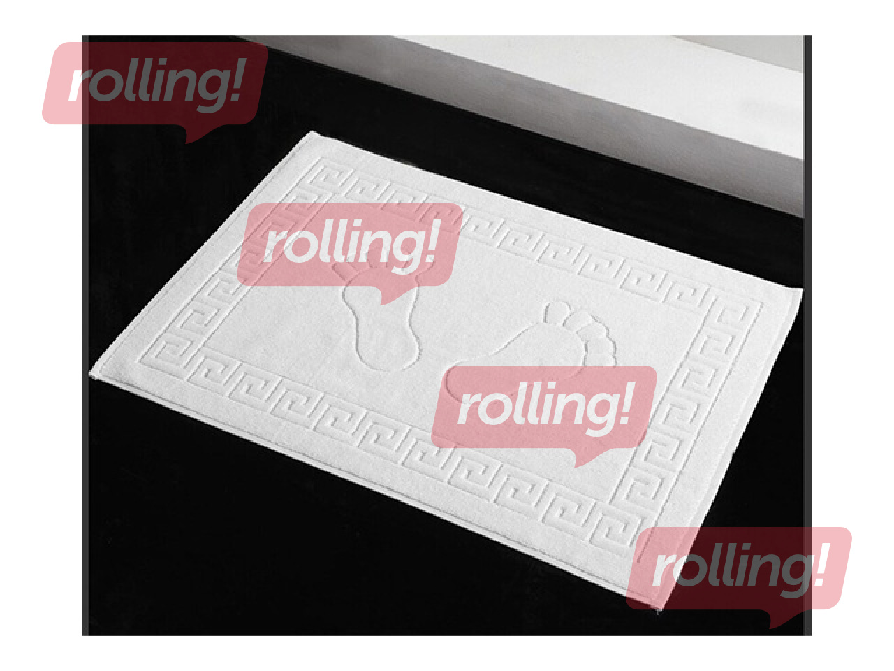 Balts vannas istabas paklājs paredzēts lietošanai mitrās telpās, nodrošinot komfortu un drošāku pārvietošanos pēc mazgāšanās. Izgatavots no 100% kokvilnas ar blīvumu 400g/m², tas labi uzsūc mitrumu un ir patīkams pieskārienam. Dekorēts ar klasisku grieķu rakstu un pēdu motīvu, savukārt 50×70cm izmērs padara to piemērotu izvietošanai pie vannas vai dušas.