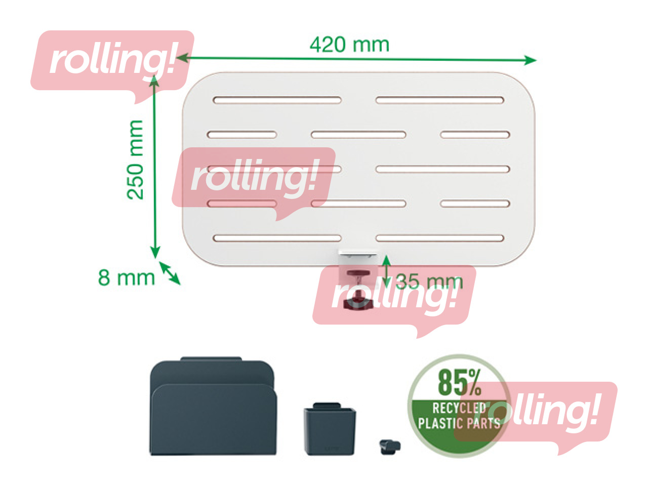 Komplektā ietilpst trīs galda organizēšanas piederumi, kas izgatavoti no 85% otrreizēji pārstrādātas plastmasas: 1 piezīmju bloka turētājs, 1 pildspalvu turētājs un 1 austiņu pakaramais āķis