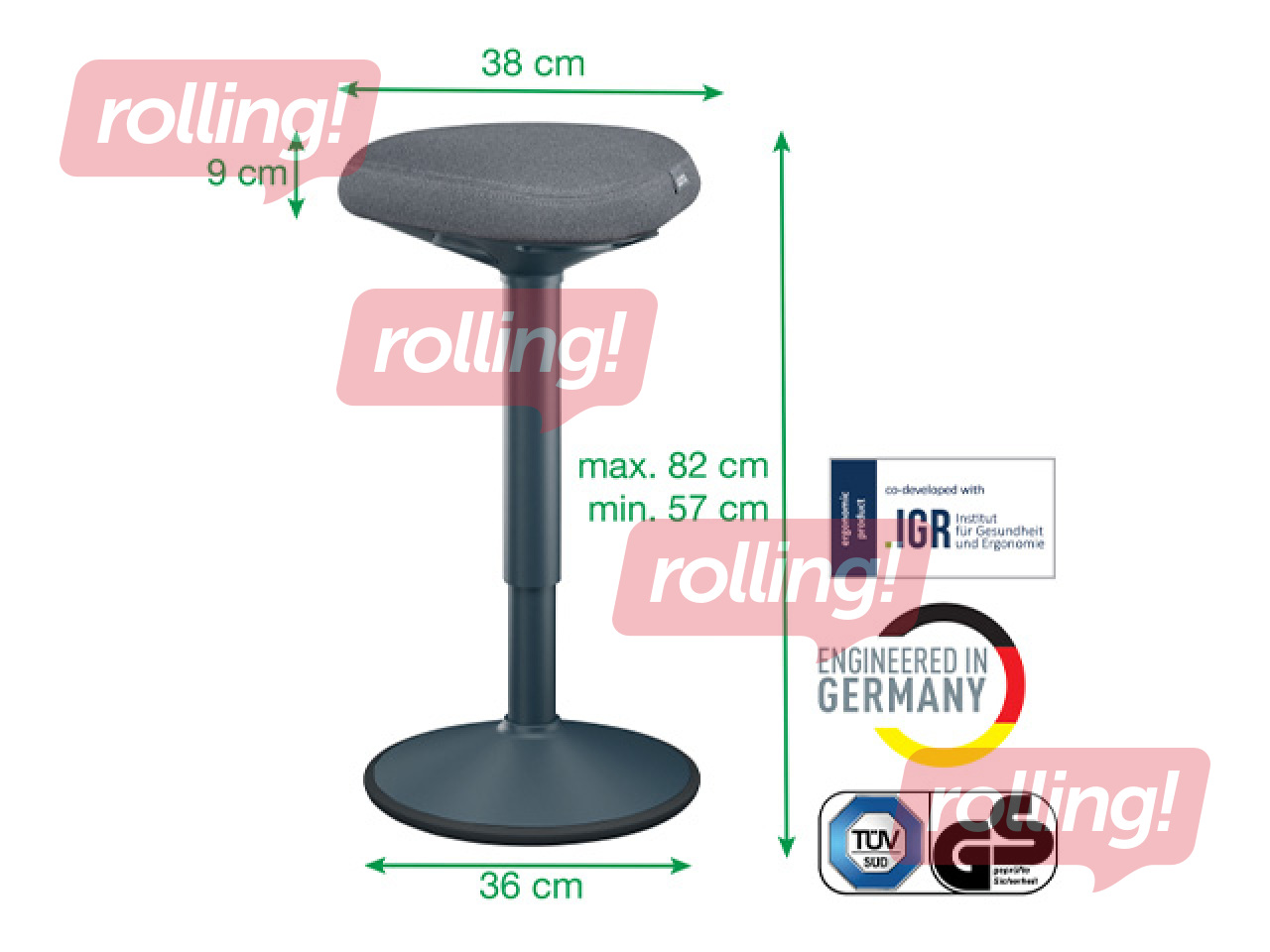 Vienmērīgs un viegls 25cm pneumātiskais augstuma regulēšanas diapazons (57-82cm), nospiežot pogu zem sēdekļa, lai sasniegtu ideālo stāvēšanas augstumu.