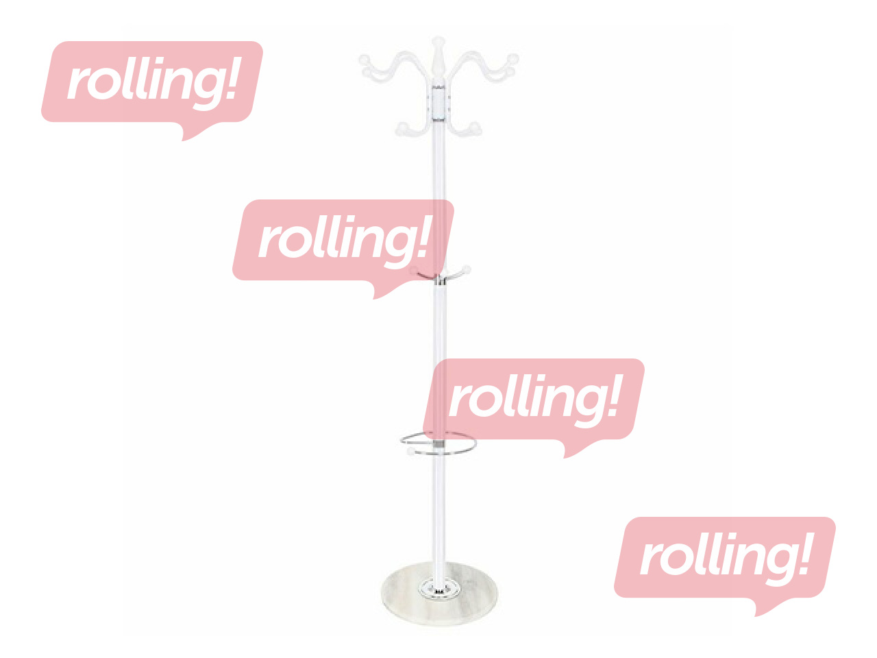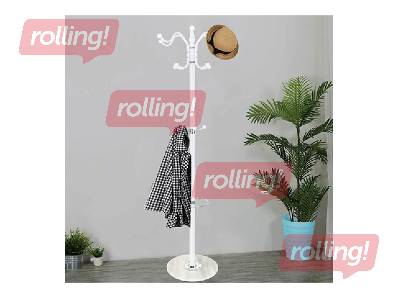 Šis Springos drēbju pakaramais ar 174cm augstumu ir elegants un funkcionāls risinājums apģērba uzglabāšanai priekšnamā vai birojā. Izturīgais 7.75kg smagais statīvs ir izgatavots no metāla un plastmasas elementiem ar stabilu 38cm diametra balta marmora pamatni.
