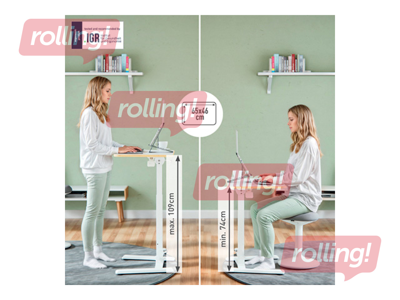 Viegli pārslēdzieties starp sēdus un stāvus pozīciju ar pneimatisko augstuma regulēšanu (74–109cm), kas palīdz izvairīties no sāpēm un veicina muskuļu kustību labākai pašsajūtai.