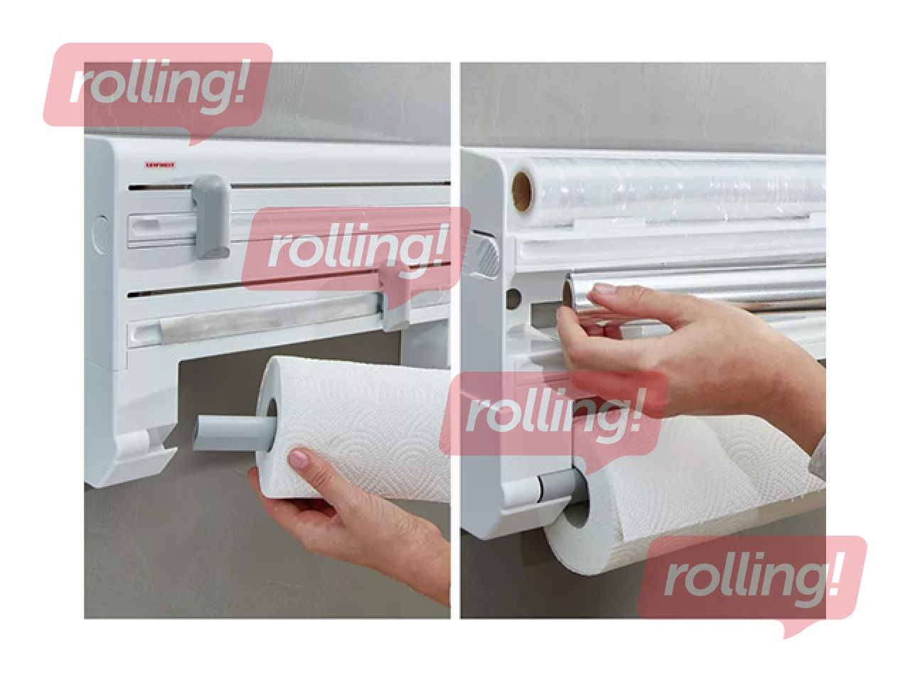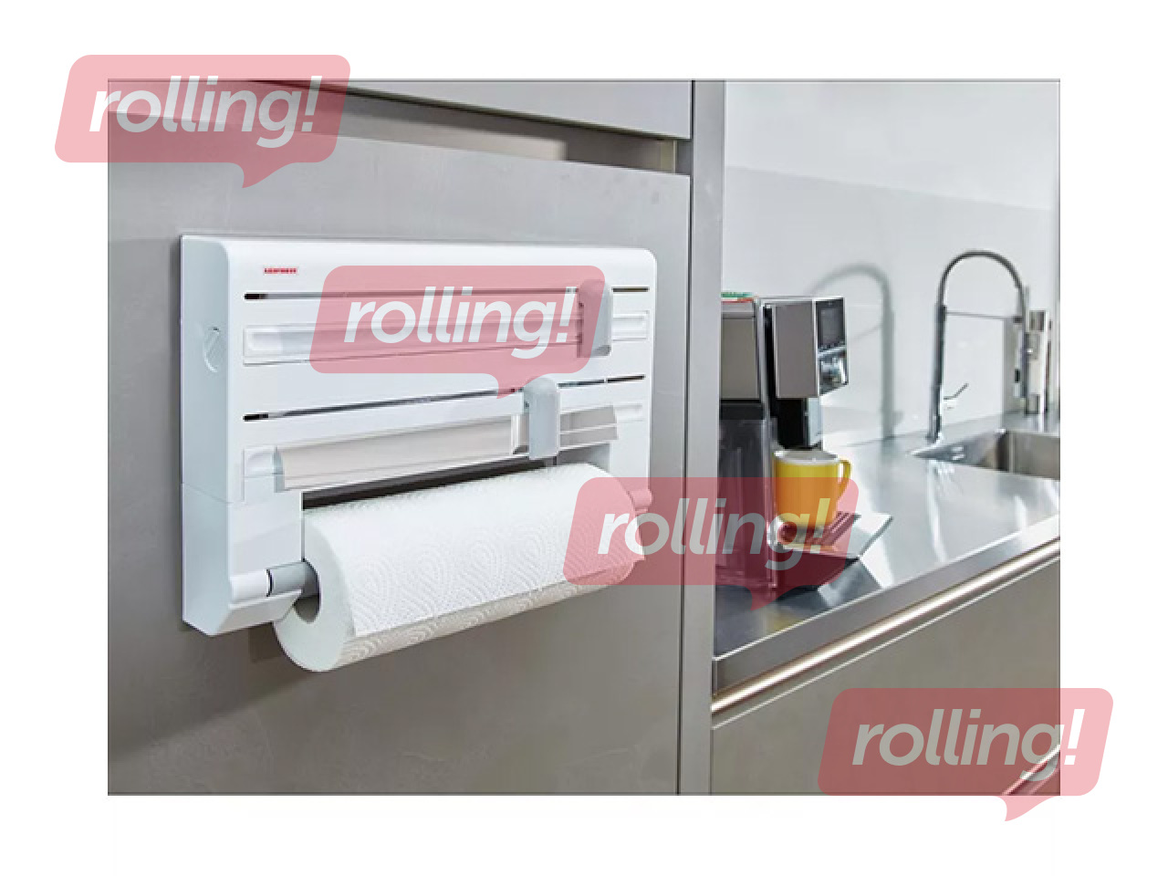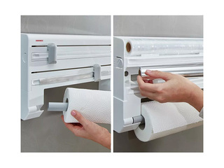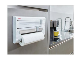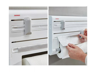 Pie sienas piestiprināms virtuves ruļļu turētājs papīra dvieļiem, folijai un pārtikas plēvei. Ar vienu loksni viss tiek paveikts — folijas gali vienmēr ir pa rokai, bet strēmeles tiek vienkārši un precīzi nogrieztas. Ruļļu nomaiņa notiek ar vienu rokas kustību. Vienkārša montāža pie sienas ar divām skrūvēm nodrošina ērtu un vietu taupošu risinājumu ikdienas virtuvē.
