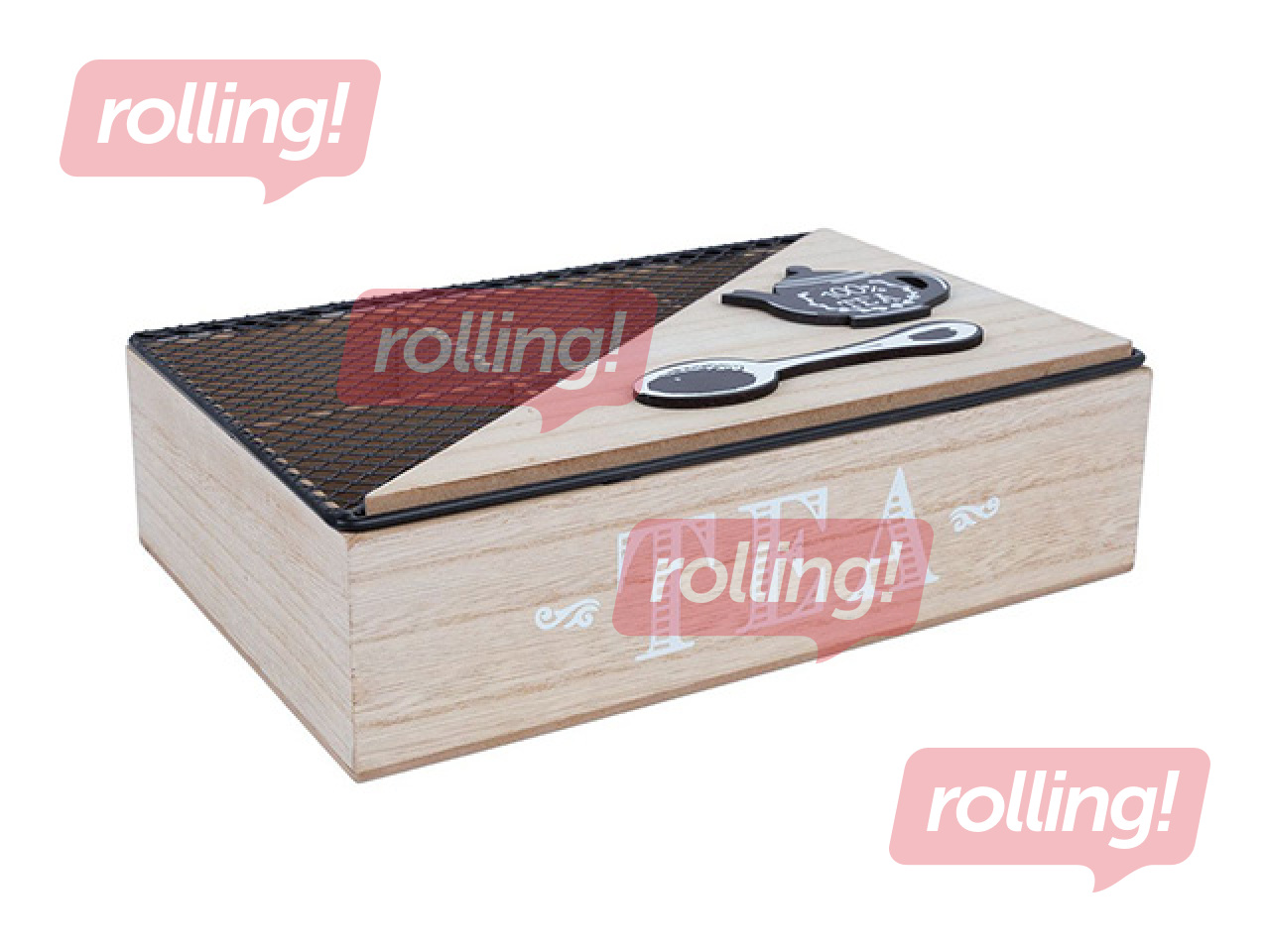 Tējas kaste Hazel paredzēta tējas maisiņu vai beramās tējas sakārtotai uzglabāšanai mājās vai biroja virtuvē. Tā izgatavota no MDF ar metāla elementiem, nodrošinot stabilu konstrukciju un praktisku lietošanu ikdienā. Kastes izmēri ir 24×16×7cm, un bēšā krāsa ļauj to viegli saskaņot ar dažādiem interjera stiliem.