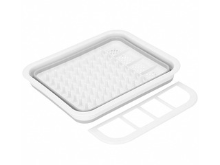 Tas ir izgatavots no izturīgas plastmasas gaiši pelēkā un baltā krāsu kombinācijā un aprīkots ar vairākiem nodalījumiem sakārtotai trauku novietošanai.