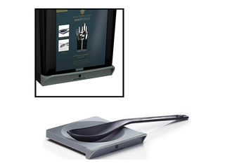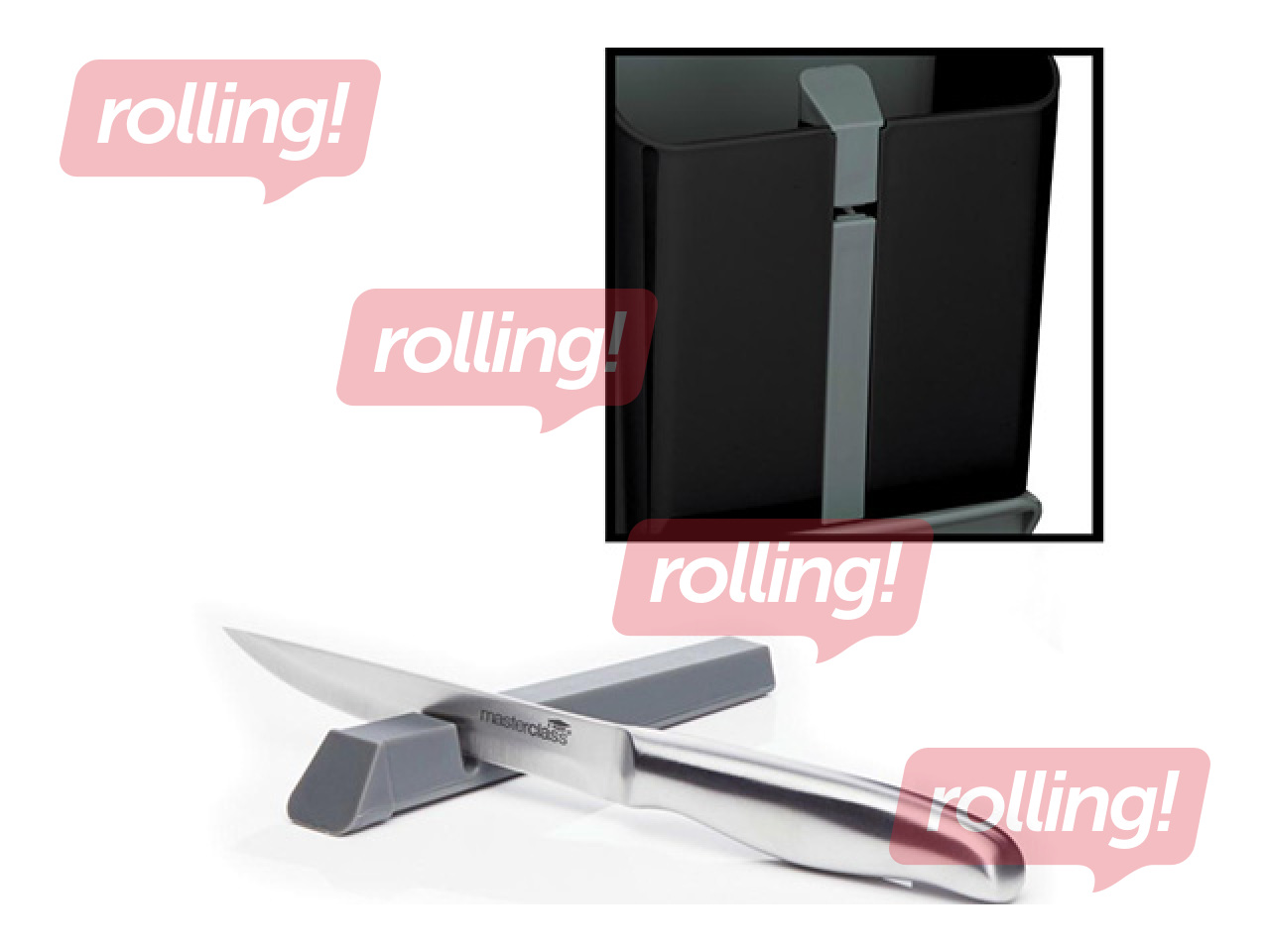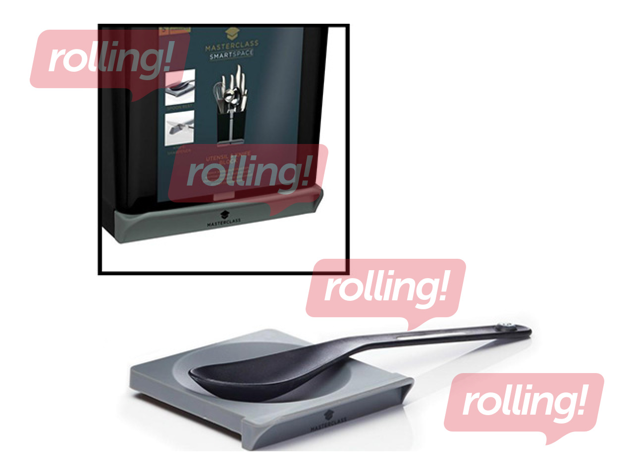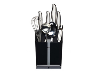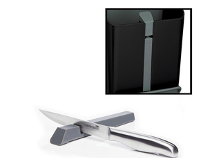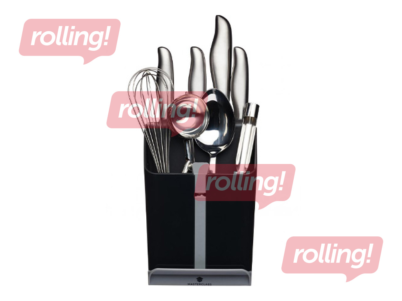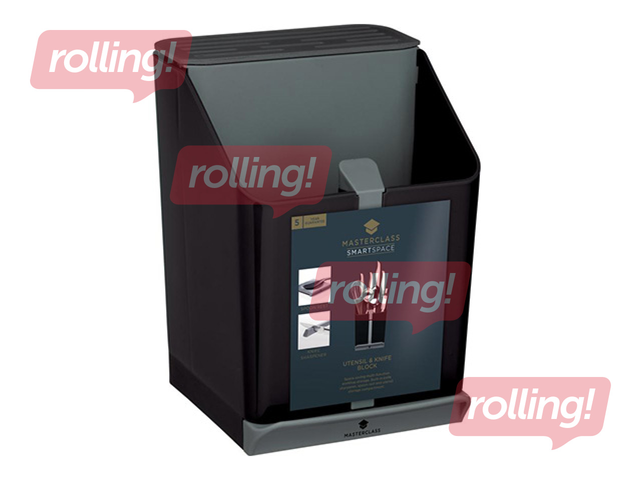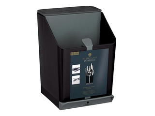 Melns "MasterClass Smart Space" galda piederumu turētājs (15 x 14 x 20,5 cm). Pārdomāts daudzfunkcionāls dizains, kas apvieno atsevišķus nodalījumus nažiem un citiem piederumiem, iebūvētu nažu asināmo, kā arī izvelkamu paliktni karotei vai kausam. Tas lieliski palīdz uzturēt kārtību un ietaupīt vietu uz virtuves virsmām. Drīkst mazgāt trauku mazgājamā mašīnā.